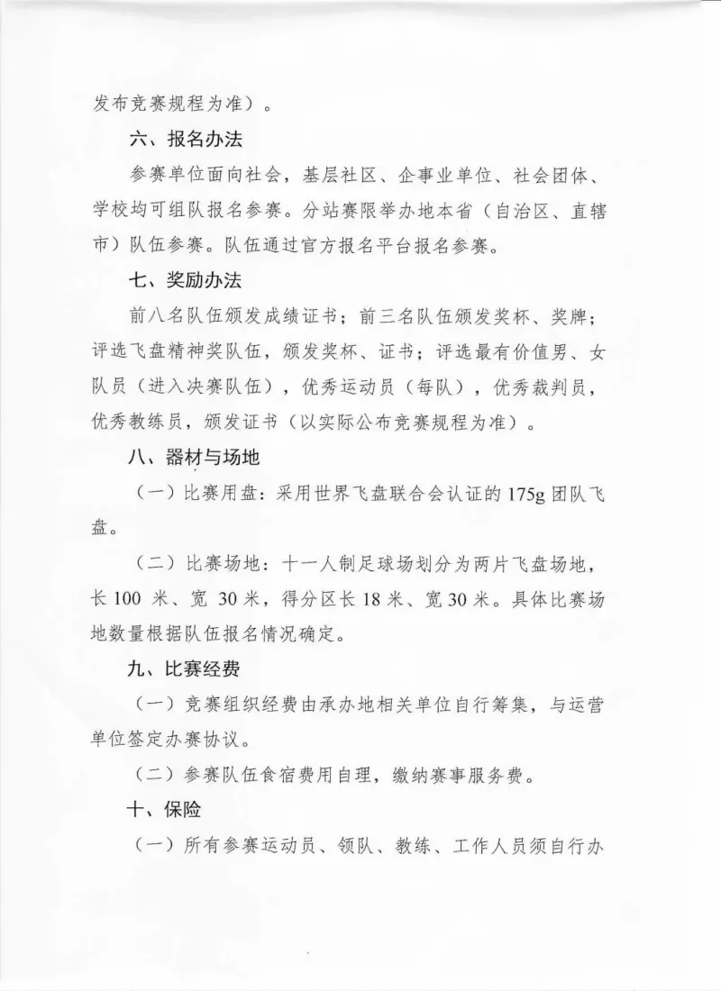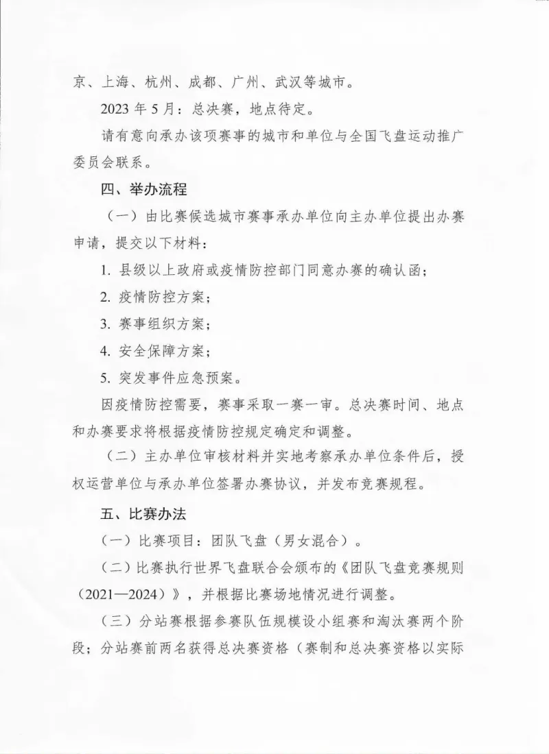 飞盘运动深受群众喜爱,近年来发展迅速,已成为全民健身活动的重要组成部分。为在疫情防控常态化背景下做好全民健身活动的推广,满足群众参加赛事活动的需求,拟于2022年下半年举办首届中国飞盘联赛。赛事名称定位2022——2023年中国飞盘联赛,设分站赛和总决赛。