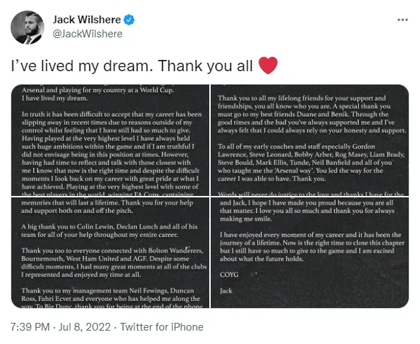 威尔希尔在长文中写到:“今天我宣布自己退役的决定,这是一段难以置信的旅程,从小男孩到阿森纳队长再到为国家队效力参加世界杯,我已经完成了我的梦想,谢谢一路上的所有人。”