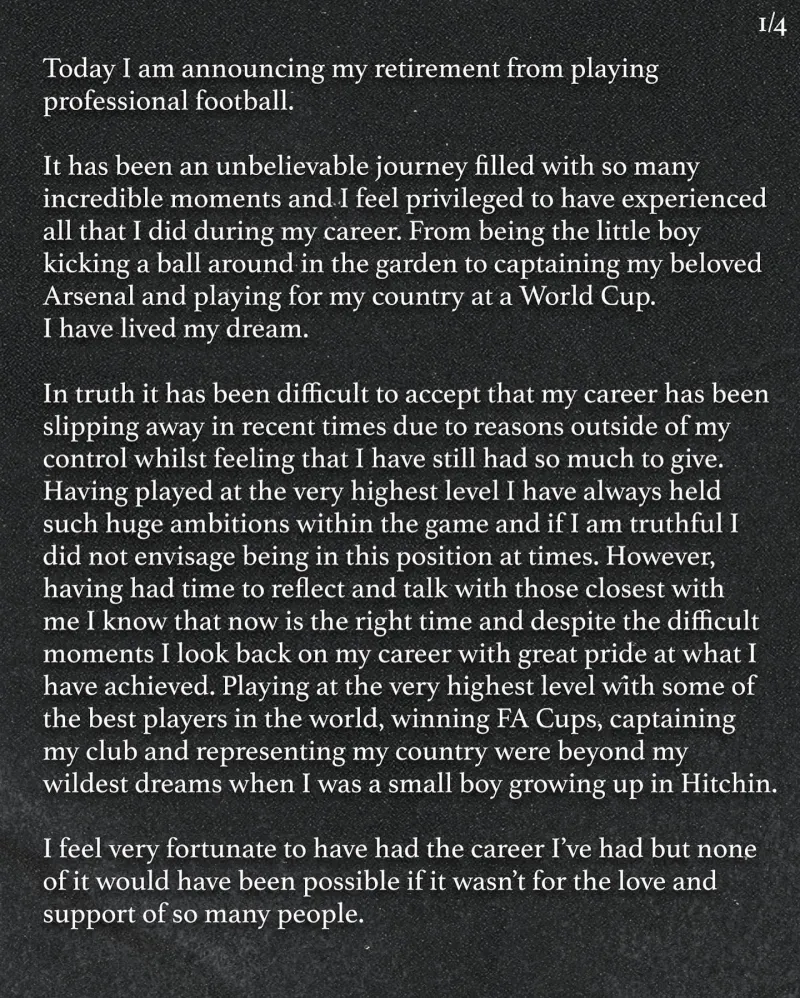 今天我宣布自己决定退役的决定,这是一段难以置信的旅程,一路走来充满了许多难以置信的时刻,我对职业生涯中所做的一切感到非常荣幸。从一个在花园里踢球的小男孩,到成为阿森纳的队长,再到为国家队效力参加世界杯,我已经完成了我的梦想。