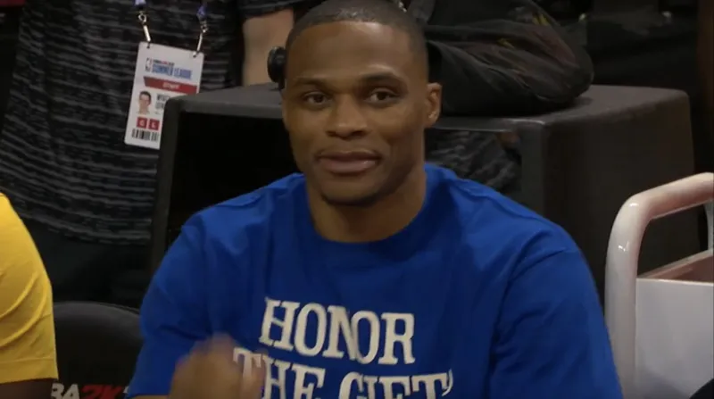 媒体SB Nation官方推特发布了詹姆斯和威斯布鲁克的观赛表情截图,并写道:“有人没告诉勒布朗说威斯布鲁克也要来看比赛。”