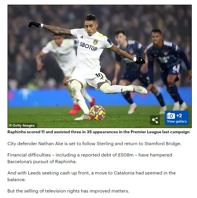 Mike Keegan也指出,由于利兹联需要预付现金,转会到加泰罗尼亚的这笔交易似乎还悬而未决。