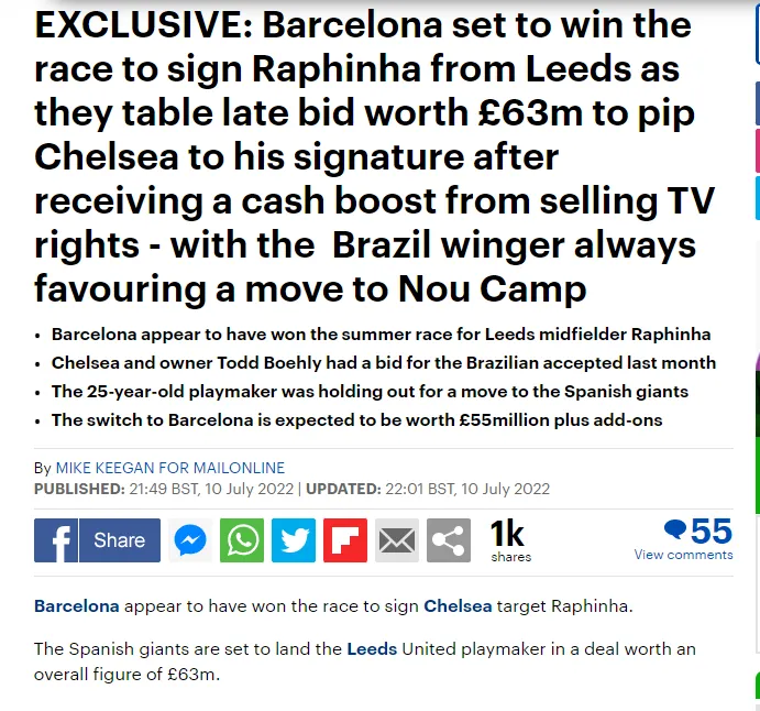 07月11日讯 根据每日邮报记者Mike Keegan的独家报道,他在标题中明确指出考虑到巴萨激活了经济杠杆,他们准备拿下拉菲尼亚。