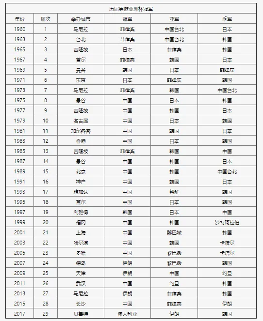 07月11日讯 男篮亚洲杯即将打响,整理历届该赛事冠军,上次中国队夺冠追溯至2015年。