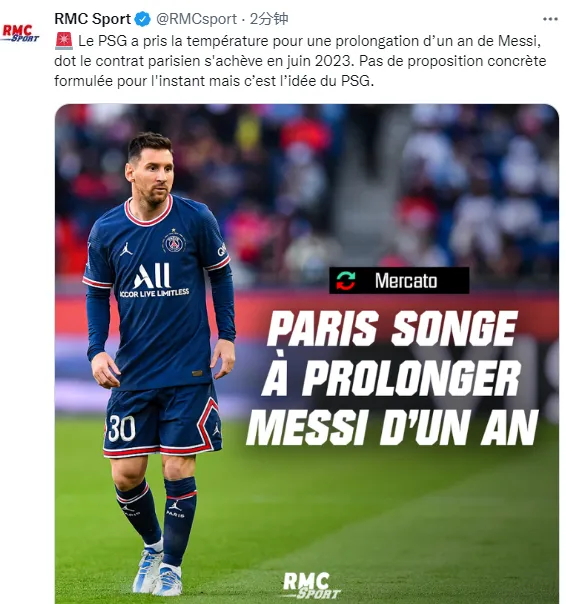 梅西的合同将于2023年到期,但在巴黎最初签下他的时候,他们的想法就是给他一份3年合约,或者是2+1的合同,最后才签下的2年合约。