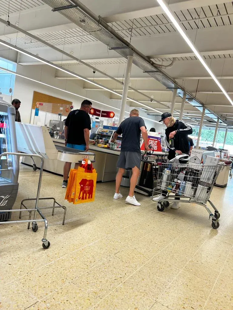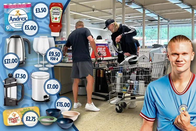 报道称,当天购物,哈兰德戴着帽子,穿着运动服,和父亲一起超市购物。一行人买了两个价值7英镑的垃圾桶和价值9.5英镑的一套4个酒杯,此外他们还买了一台价值7.5英镑的咖啡壶,一套价值15英镑的四件碗筷套装,一包5英镑的卫生纸和一罐50便士的英式芥末,此外还有一些鸡蛋、一个水壶,价值3.5英镑的大瓶番茄酱。