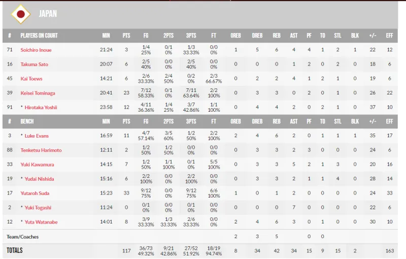 日本:埃文斯11分6板2助、西田优大6分3板4断、富坚勇树7助、渡边雄太8分6板3助、吉井裕鹰12分4板2助、井上宗一郎3分6板4助2断、富永启生23分3板、须田侑太郎33分、河村勇辉7分5板3断。