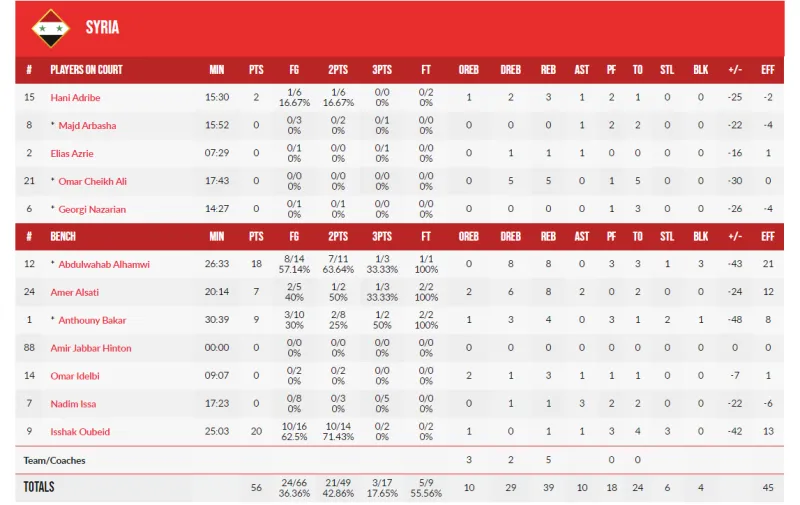 叙利亚:阿尔汉姆维18分8板3帽、贝卡9分4板2断、奥贝德20分3断、阿尔萨蒂7分8板2助。