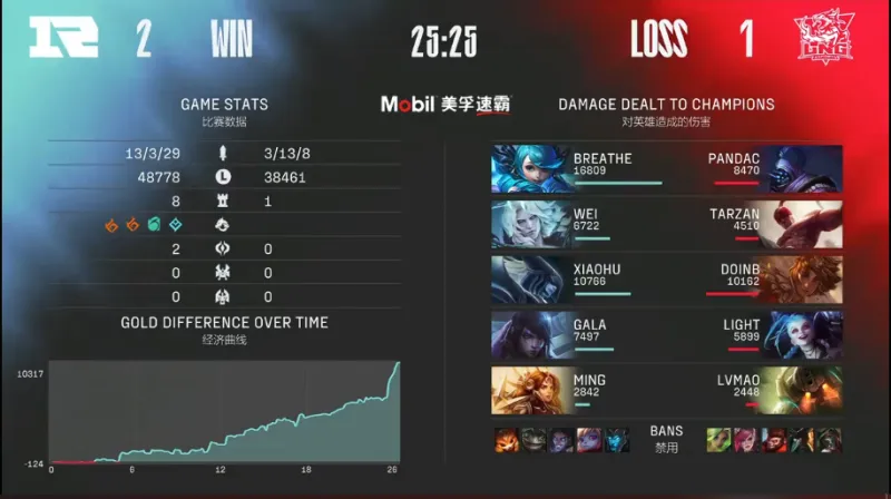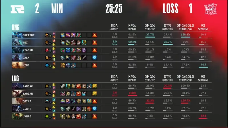 25分钟:RNG在红buff附近击杀对方武器,随后摧枯拉朽击杀对方剩余四人打出零换五一波结束比赛