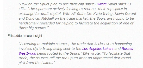 “马刺正在积极寻求出售他们的薪金空间以换取大量选秀资产。像凯里-欧文、凯文-杜兰特和多诺万-米切尔这样的全明星球员依然在交易市场上,马刺希望能够通过帮助促成一些球队收购这些大牌球员,从中获得丰厚的选秀权回报。”