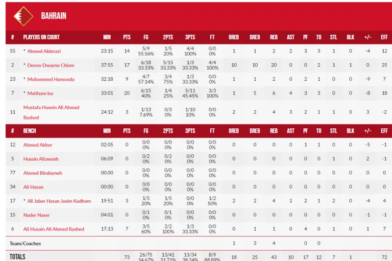 巴林:奇斯姆17分20板,艾萨20分6板4助,阿尔德拉奇14分2板,凯德赫姆3分4板,哈穆达9分2板。