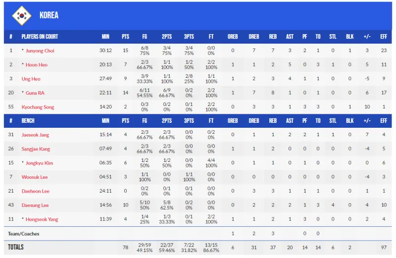 韩国:罗健儿14分8板,崔俊勇15分7板3助,许勋7分5助,许雄9分3板4助,梁洪锡4分2板,金钟奎6分,李大成10分4断。