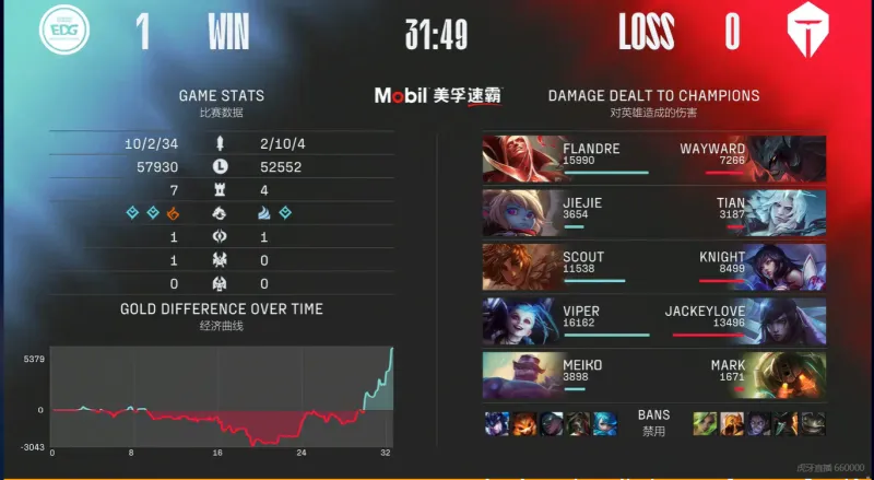 31分钟,剑魔率先阵亡,金克丝触发被动,EDG一鼓作气一波终结比赛。