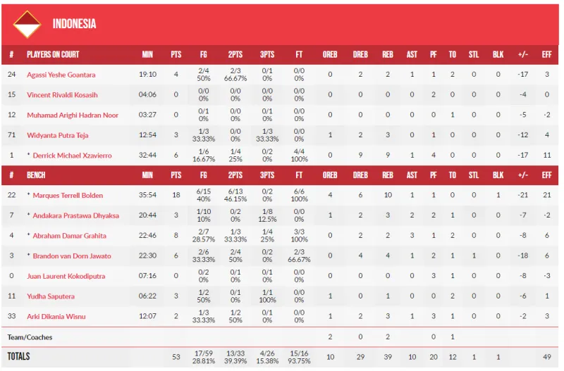 印度尼西亚:博尔登18分10板、达克萨3分3板2助、格拉希塔8分2板3助、贾瓦托6分4板、克扎维耶罗6分9板。