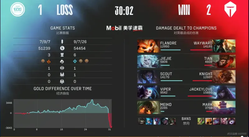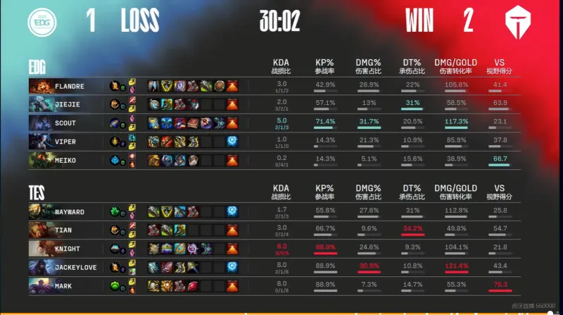 EDG选用:Flandre纳尔、Jiejie破败之王、Scout塞拉斯、Viper金克丝、Meiko泰坦