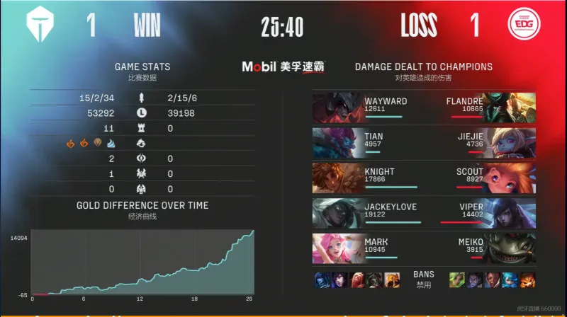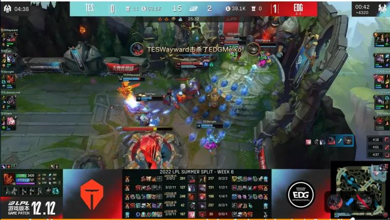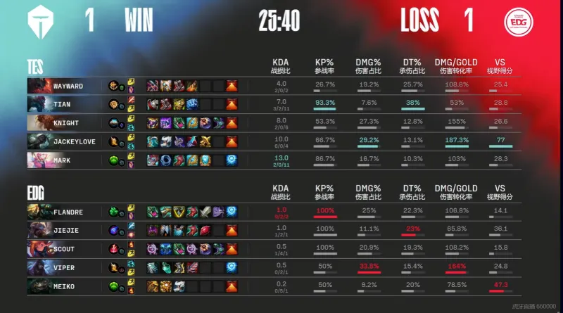 25分钟,TES依靠大龙持续推进,正面团战EDG无力抵抗,TES一波终结比赛。