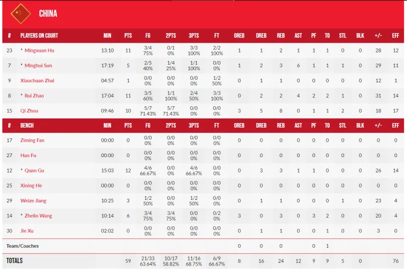 本场比赛上半场,中国队三分16投11中:顾全6中4,胡明轩3中3,孙铭徽1中1,赵睿4中2,姜伟泽2中1。