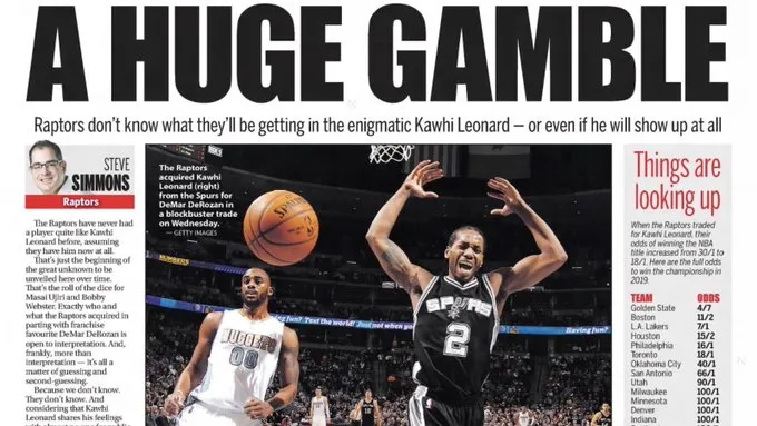 2018年的今天,猛龙从马刺交易得到科怀-伦纳德。