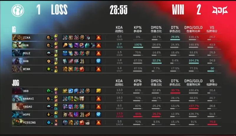 28分钟:JDG携大龙buff推上高地强开打出团灭一波结束比赛