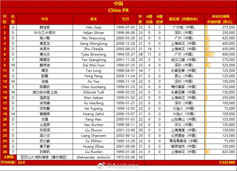 07月18日讯 德转管理员朱艺在个人微博公布了中国队此次参加东亚杯的球员球衣号码。