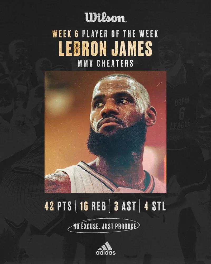 “还能是别人吗?十多年来首次回归德鲁联赛,勒布朗-詹姆斯当选第6周的最佳球员。这也不是一个政治选择;在一场打满全场40分钟的比赛后(常规赛罕见),国王得到42分16篮板4次抢断3助攻,并率队以104:102战胜黑珍珠精英队。Cheaters队的胜利使他们以6胜0负的完美战绩成为本赛季仅存的一支不败球队。”德鲁联赛官方写道。