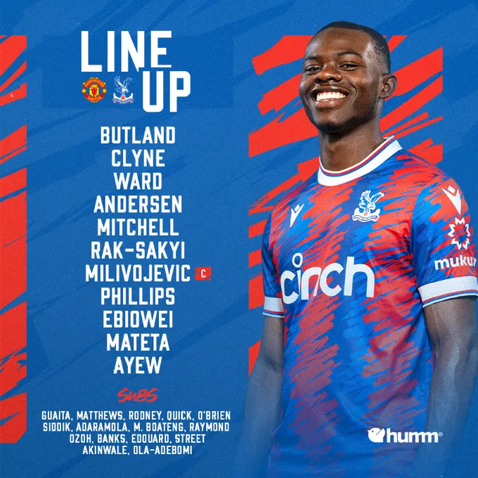 水晶宫首发:巴特兰德、克莱因、沃德、安德森、米切尔、沙克尔、米利沃耶维奇、菲利普斯、埃比沃维、马特塔、阿尤