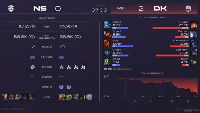 36分钟,阿木木先行开团,DK顺势反打将格温击杀,NS持续减员,DK一波终结比赛。