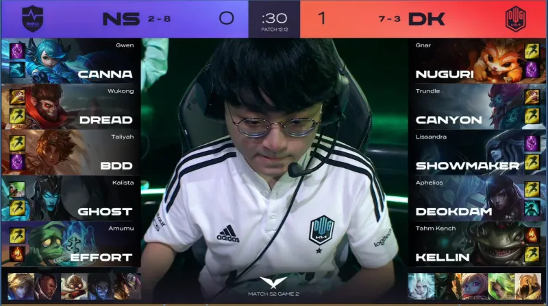 DK选用:Nuguri纳尔、Canyon巨魔、ShowMaker冰女、deokdam厄斐琉斯、Kellin塔姆