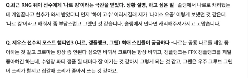 Q:最近Wei选手称赞你为纳尔King,可以说明一下当时的情况吗?有没有什么想说的话呢?