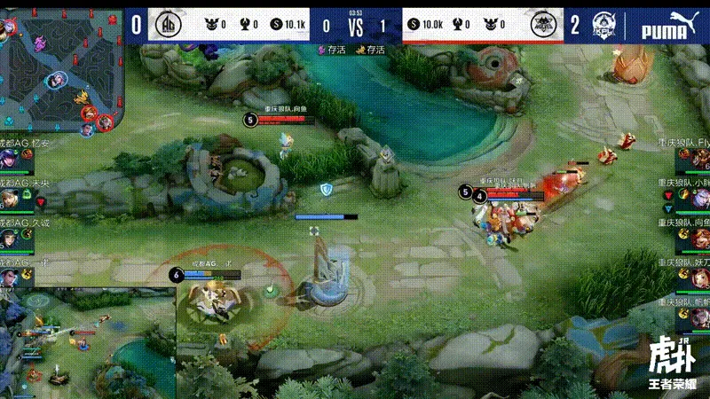 7分38秒,中路团战打响,Fly关羽巧妙绕后切入,大招推到3人,重庆狼队团灭AG超玩会