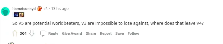 也有网友表示“所以V5是一支潜在的顶级强队,而V3又谁都打不过,那么V4会是什么样子呢?(各大联赛并没有队伍叫V4)”