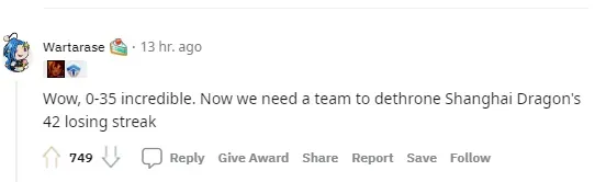 此事在reddit也引起广泛热议,有网友表示35连败真是一个奇迹,现在我们需要看一看有没有队伍能打破上海龙之队(守望先锋战队)的42连败。