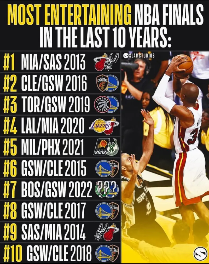 07月26日讯 近日美媒SlamStudios发布讨论话题:近十年的总决赛,按喜爱程度排序你会怎么排?
