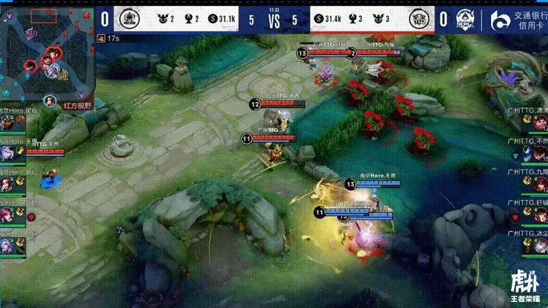 2分18秒,河道爆发团战,星痕关羽拍马赶到,配合紫幻不知火舞收割残局,Hero拿到第一滴血