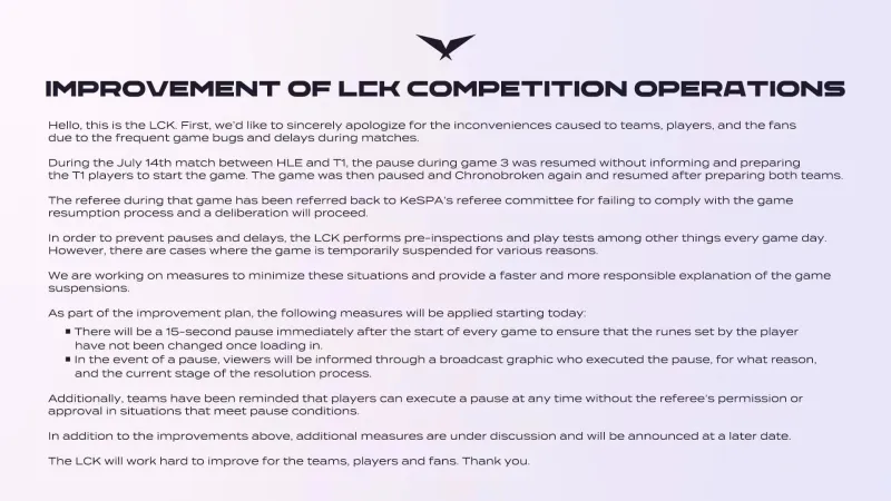 由于此前比赛中出现的符文bug,LCK官方对暂停规则进行了改动,该规则将于今日开始施行,以下是改动规则: