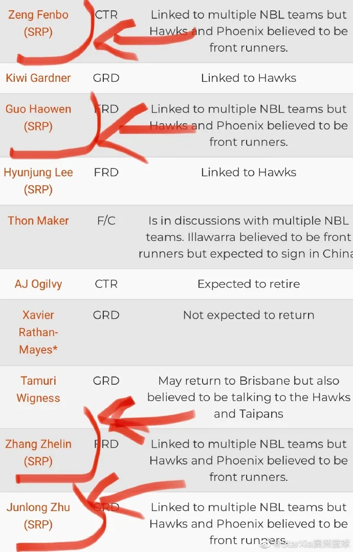 原文:“东南墨尔本凤凰与伊拉瓦拉老鹰为首多只NBL球队,有意向使用SRP合约签下中国球员:曾凡博、郭昊文、张镇麟、朱俊龙。”