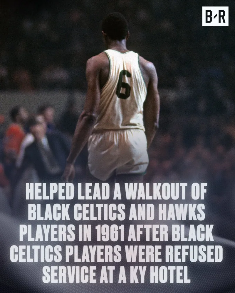 ——在1961年,当凯尔特人阵中的黑人球员在一家旅馆拒绝被接待之后,拉塞尔引领了一场罢工来捍卫黑人主权(看过电影《绿皮书》的同学应该都记得这个桥段)
