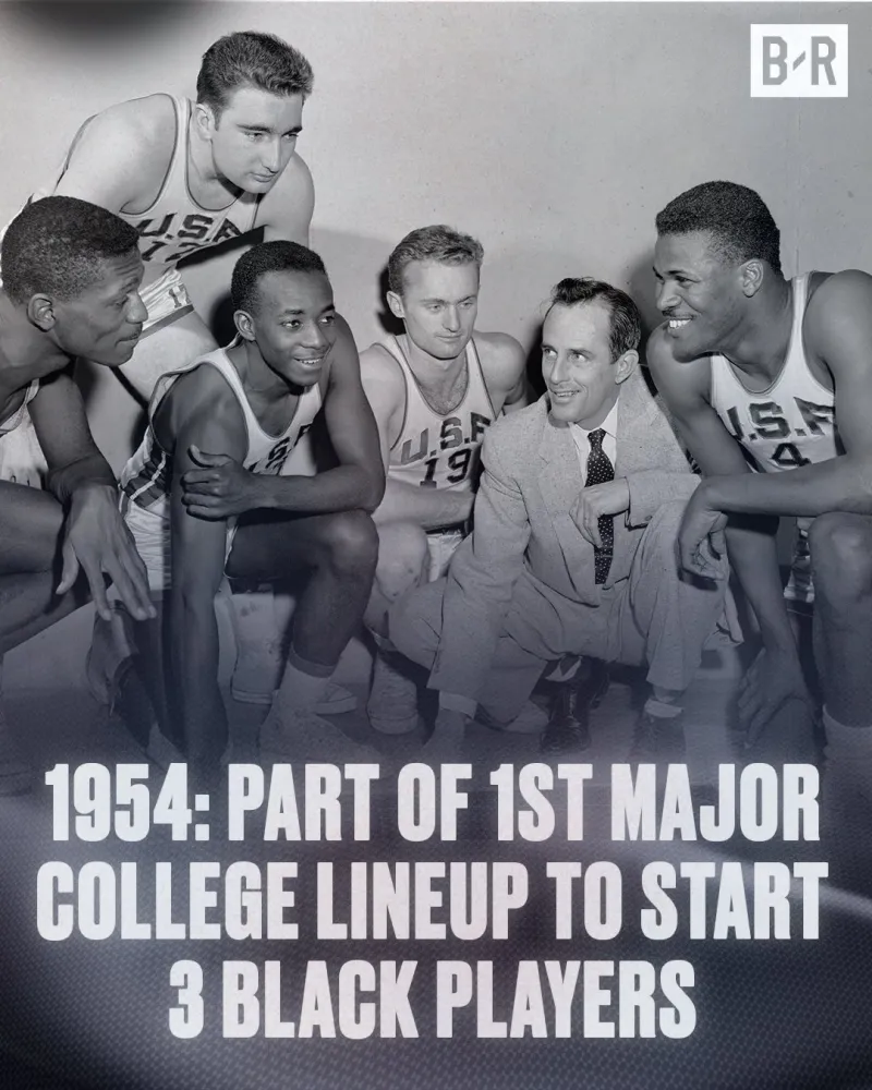 ——史上第一套有三名黑人首发登场的大学首发阵容,拉塞尔为其中之一(1954年)