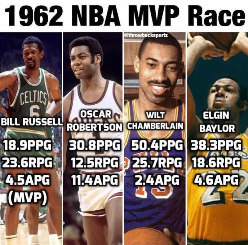 在1961-62赛季,威尔特-张伯伦场均能得到50.4分25.7个篮板,“大O”奥斯卡-罗伯特森场均能得到30.8分12.5篮板11.4助攻的30+三双数据,但最后该赛季的MVP被比尔-拉塞尔夺得。