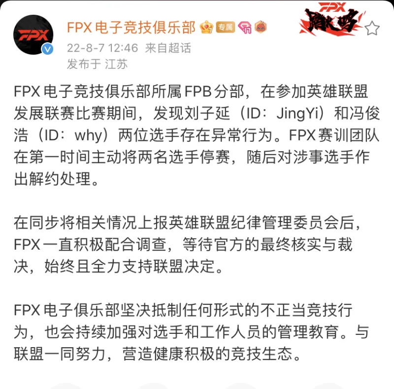 FPX电子竞技俱乐部所属FPB分部,在参加英雄联盟发展联赛比赛期间,发现刘子延(ID:JingYi)和冯俊浩(ID:why)两位选手存在异常行为。FPX赛训团队在第一时间主动将两名选手停赛,随后对涉事选手作出解约处理。