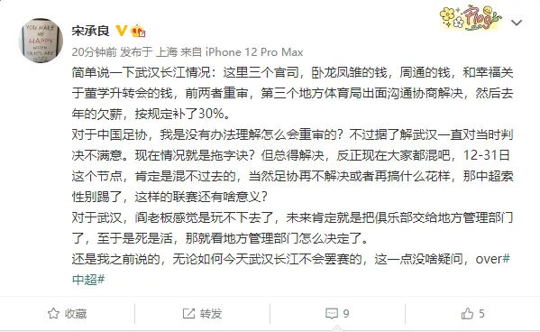 对于中国足协,我是没有办法理解怎么会重审的?不过据了解武汉一直对当时判决不满意。现在情况就是拖字诀?但总得解决,反正现在大家都混吧,12-31日这个节点,肯定是混不过去的,当然足协再不解决或者再搞什么花样,那中超索性别踢了,这样的联赛还有啥意义?