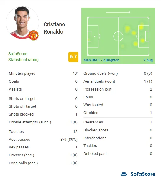 C罗本场比赛中共登场43分钟共触球12次,贡献出89%的传球成功率,1次关键传球,1次射门被封堵,越位1次。