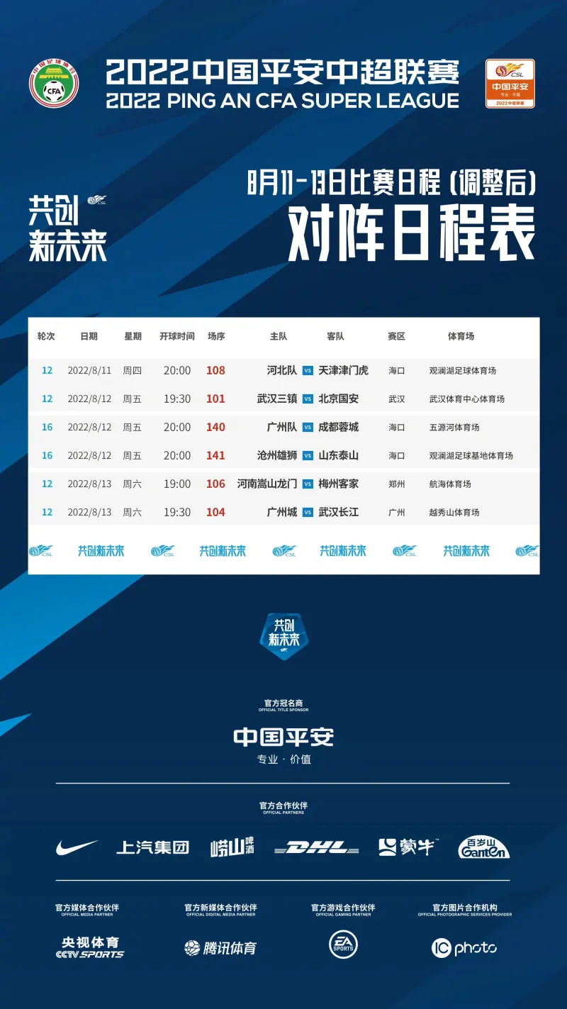 受海口疫情影响,2022中国平安中超联赛第12轮部分场次比赛无法正常进行,经中超联赛组委会研究,并沟通相关俱乐部、赛区,征得有关方面同意,决定调整中超联赛8月11-13日比赛安排如图。