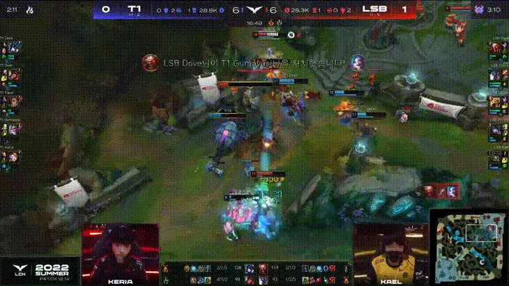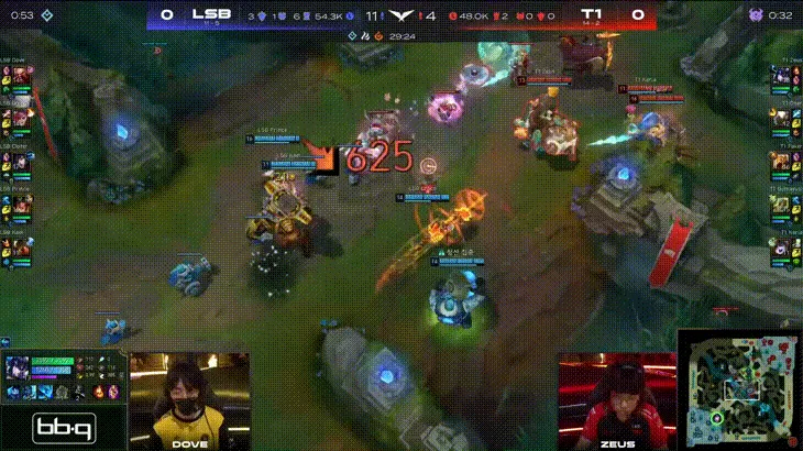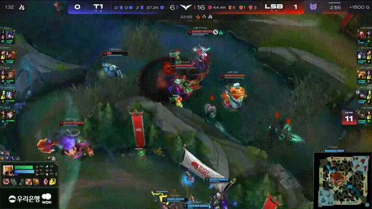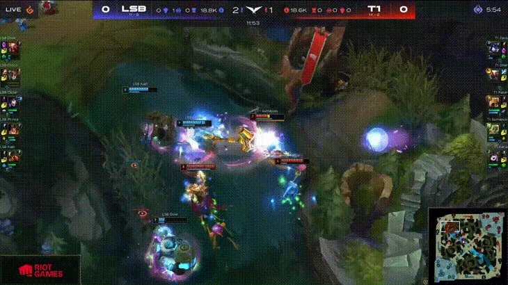 比赛第11分钟,双方在上路河道爆发团战,T1追击途中Gumayusi泽丽翻墙落地就被阿狸控到秒掉,LSB打出1换3。