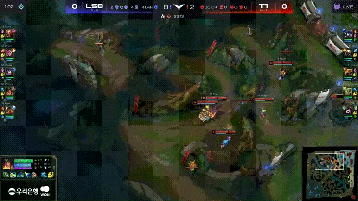 比赛第20分钟,LSB在野区击杀T1上中两人。
