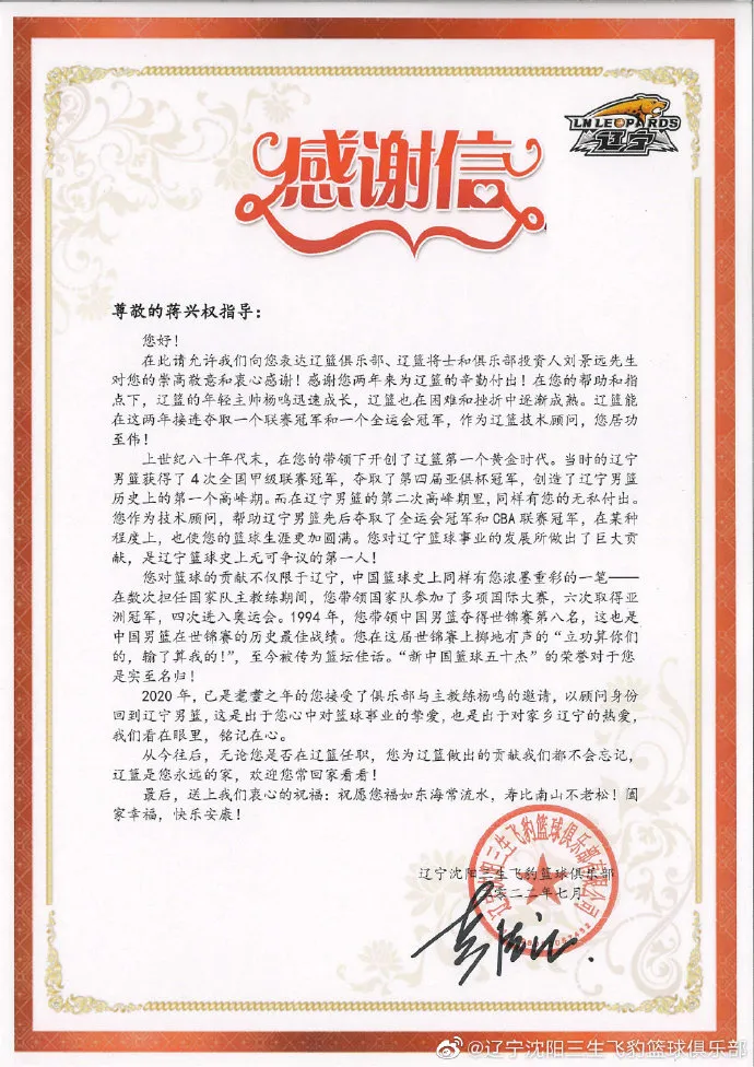 08月12日讯 今日,辽宁飞豹篮球俱乐部发长文,向蒋兴权指导致谢致敬。原文如下: