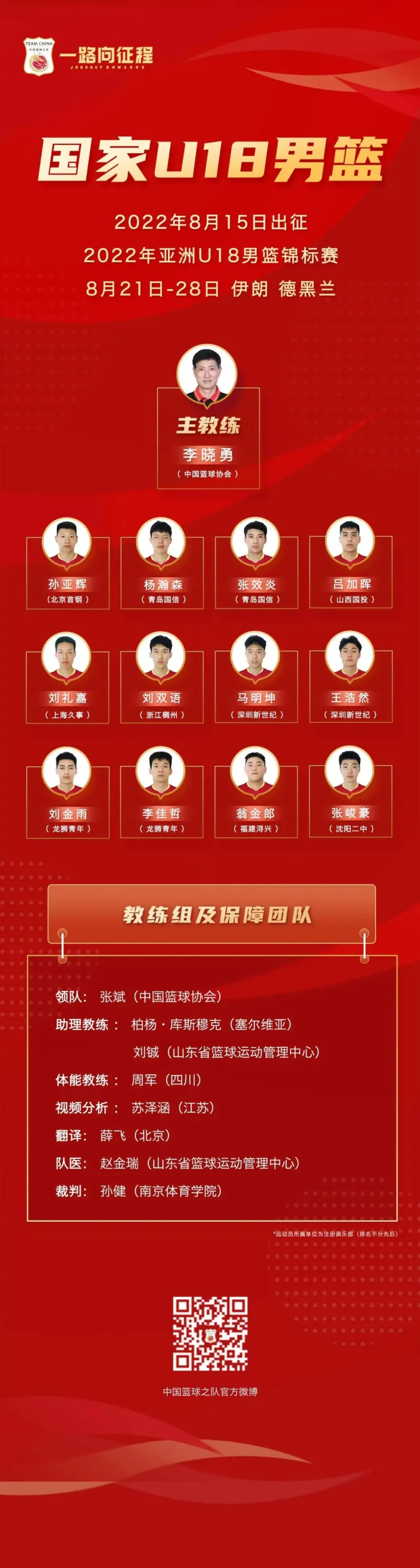 08月15日讯 中国篮协官方公布了U18亚锦赛中国国青男篮12人大名单,青岛内线杨瀚森领衔,李晓勇担任主教练。