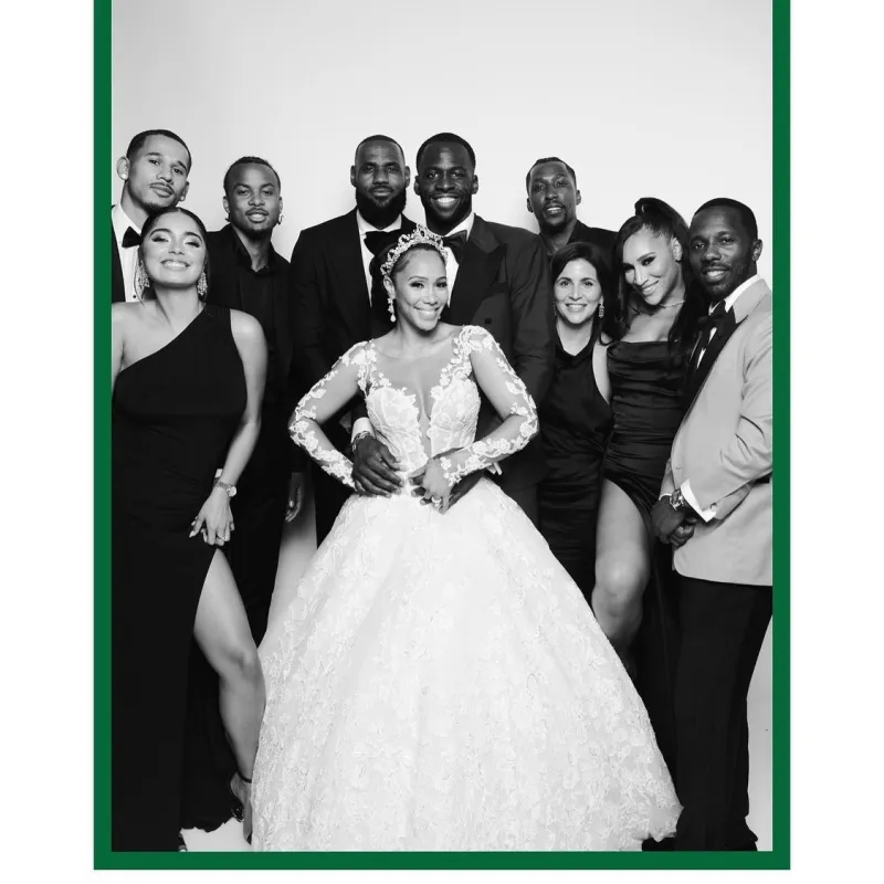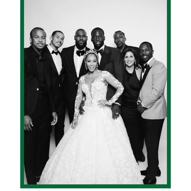 在Leff晒出的婚礼合影中,除格林夫妇外还包括勒布朗-詹姆斯夫妇、肯塔维厄斯-考德威尔-波普夫妇、胡安-托斯卡诺-安德森、摩西-穆迪、里奇-保罗。