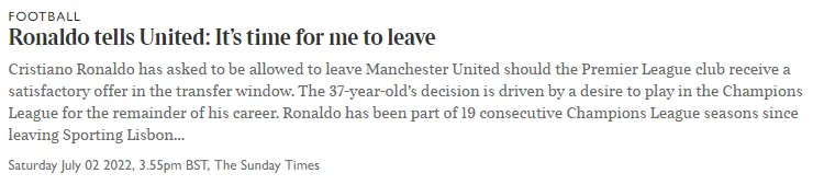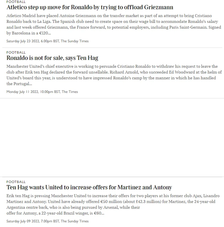08月16日讯 国外球迷在为泰晤士报供稿的著名记者Duncan Castles(被誉为门德斯喉舌,最早独家了C罗告知曼联想离开)最新报道滕哈格愿意放走C罗,以及西蒙尼愿意用格列兹曼换C罗之后,整理了Duncan Castles今夏在泰晤士报刊发的几个独家报道。