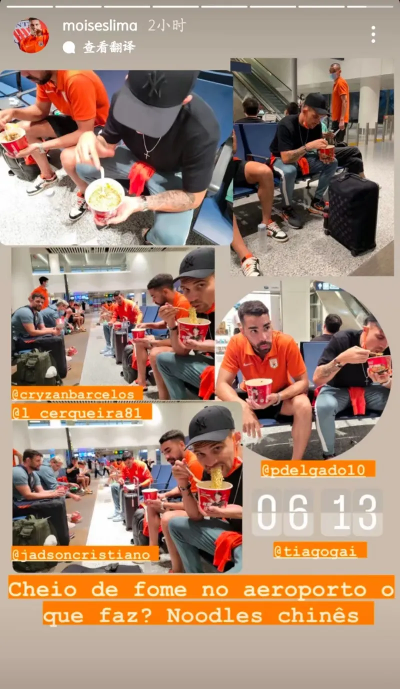 莫伊塞斯晒出的照片里,德尔加多、克雷桑、贾德松三人都在吃泡面。莫伊塞斯也写道:“在机场饿了怎么办?品尝中国的泡面。”