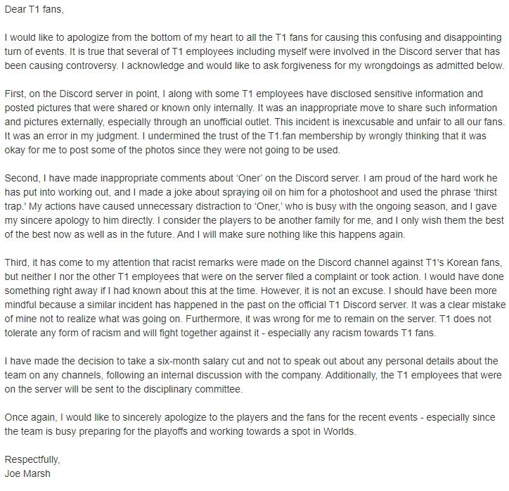 首先,就目前对粉丝造成的困扰和失望表示诚挚的歉意。包括我在内的几位T1职员参与了近期引起争议的T1粉丝Discord服务器;在此,我想就在该频道上犯下的几点错误道歉。